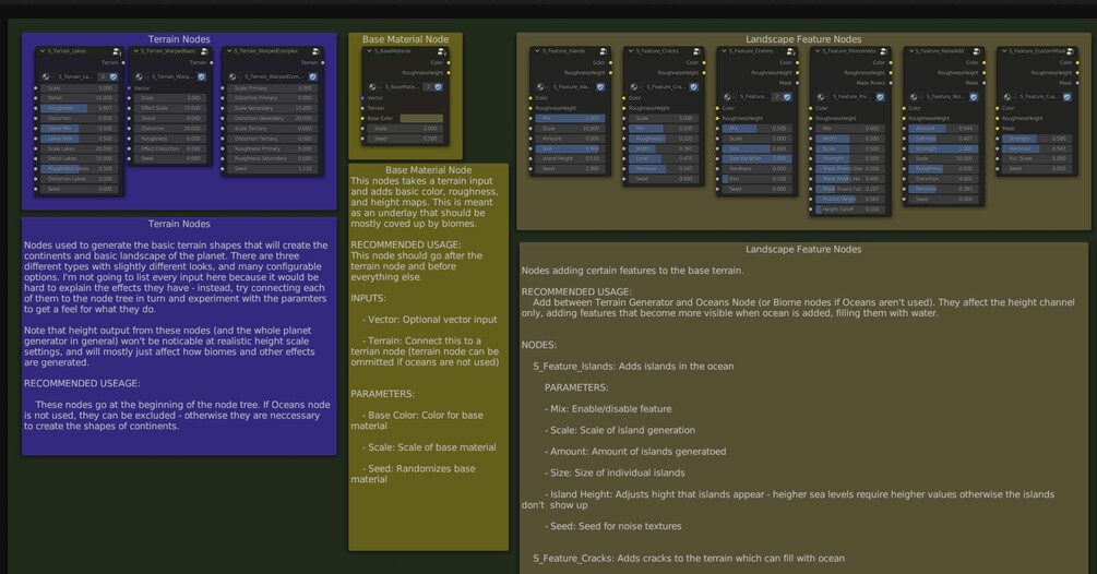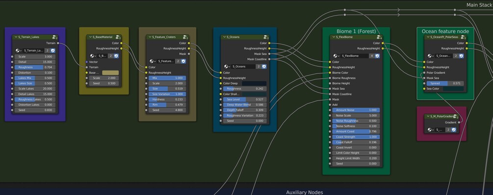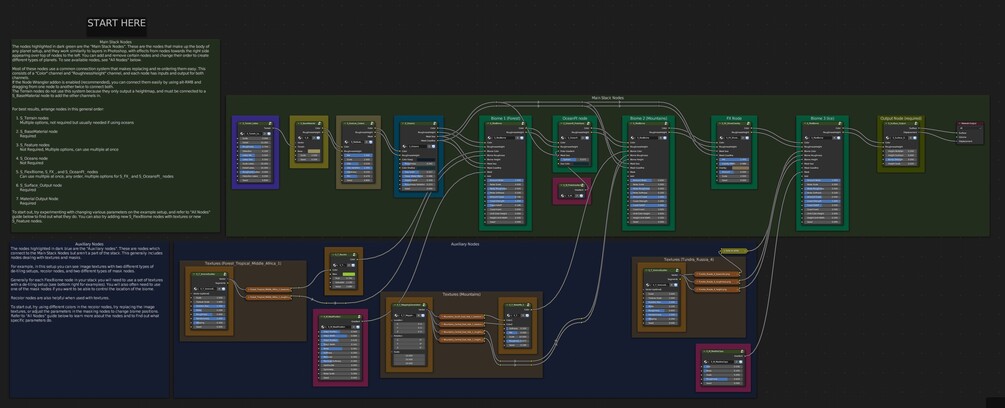 This planet generator system uses a modular, layer-like approach which makes setting up new planets very quick once you're familiar with how the nodes connect to each other. It takes some learning to get used to using these node groups, which is the sacrifice we must pay for customizability - making a simpler system would be possible, but the variety of planets you could create would be limited.